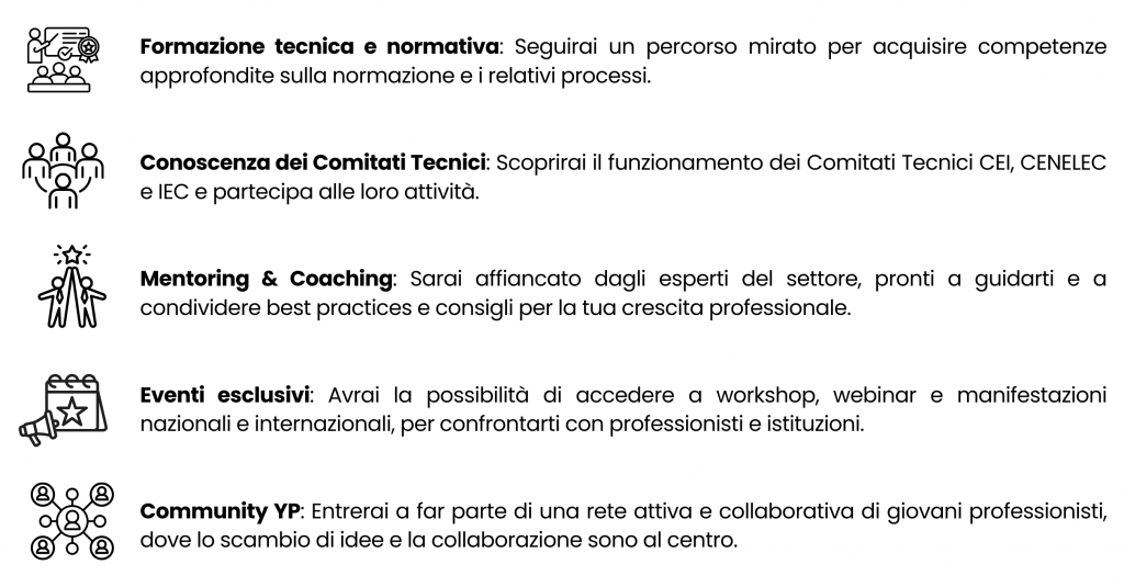 Il CEI aderisce ogni anno all’iniziativa globale IEC Young Professionals, favorendo la partecipazione italiana ai lavori di normazione e alla cooperazione internazionale, un’opportunità unica per i professionisti all’inizio della carriera di interagire con esperti internazionali, sviluppare capacità di leadership e contribuire allo sviluppo di standard globali. Ogni anno vengono selezionati fino a 3 giovani professionisti che rappresentano l’Italia al Workshop annuale IEC, portando le proprie idee e competenze su scala mondiale.